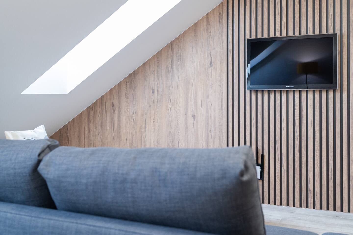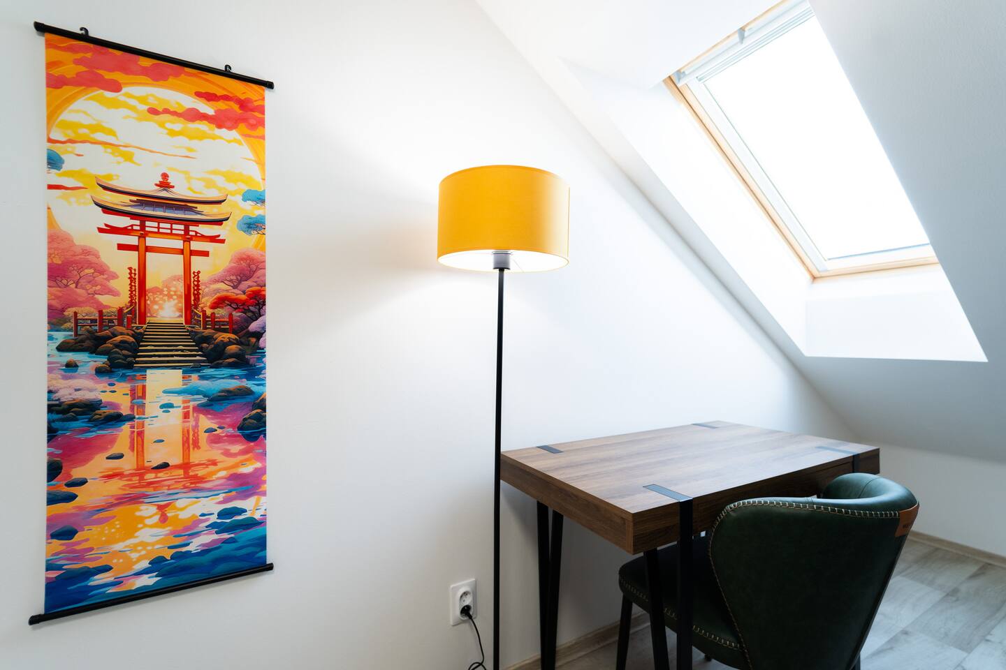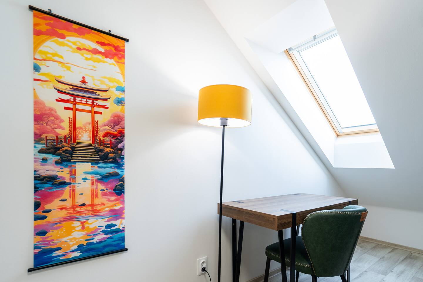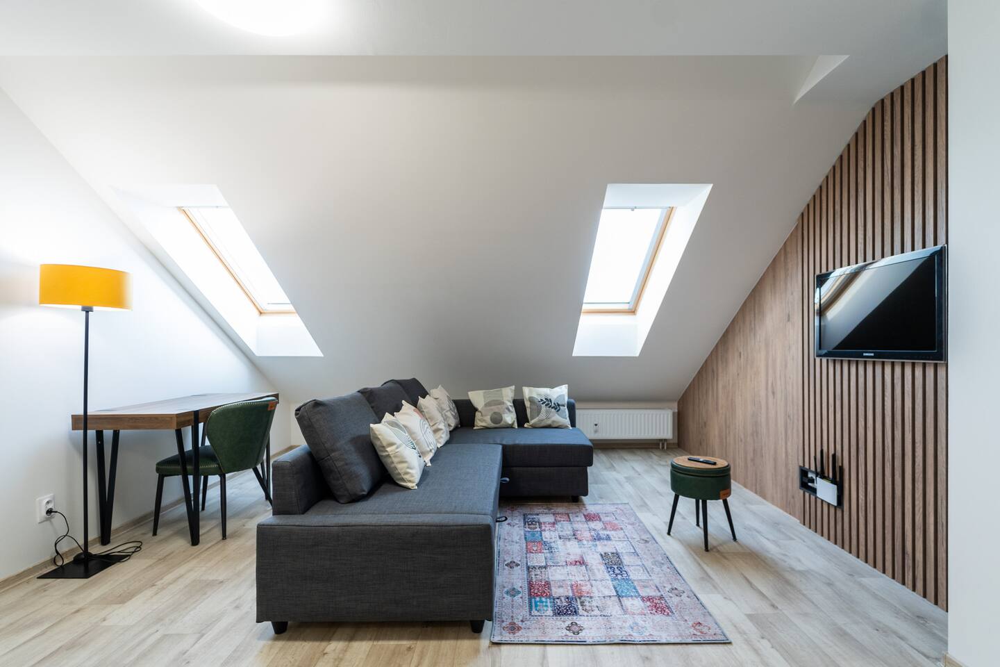 This attic 2-bedroom apartment is located in the heart of Brno, just a few steps from the main train station. Flat offers everything needed for a comfortable stay. The spacious bedroom ensures a peaceful night's sleep, while the living room features a sofa bed for additional guests. The kitchen is fully equipped, and the bathroom includes a washing machine for longer stays. Thanks to its attic design, the apartment has a unique atmosphere that guarantees a pleasant and relaxing experience.